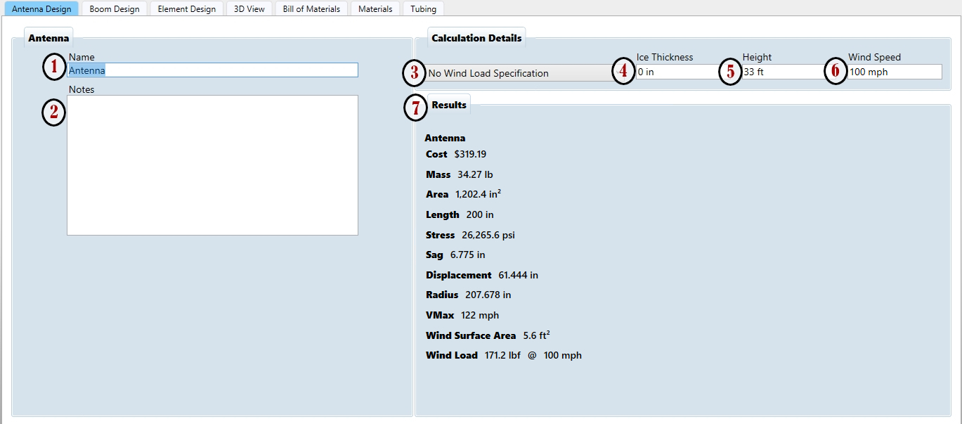 - Wind Speed Field - While the Results Pane will show the maximum wind speed where all parts of the antenna are within their material’s yield stress, you can set a specific wind speed here to see resulting calculations for that amount of wind.