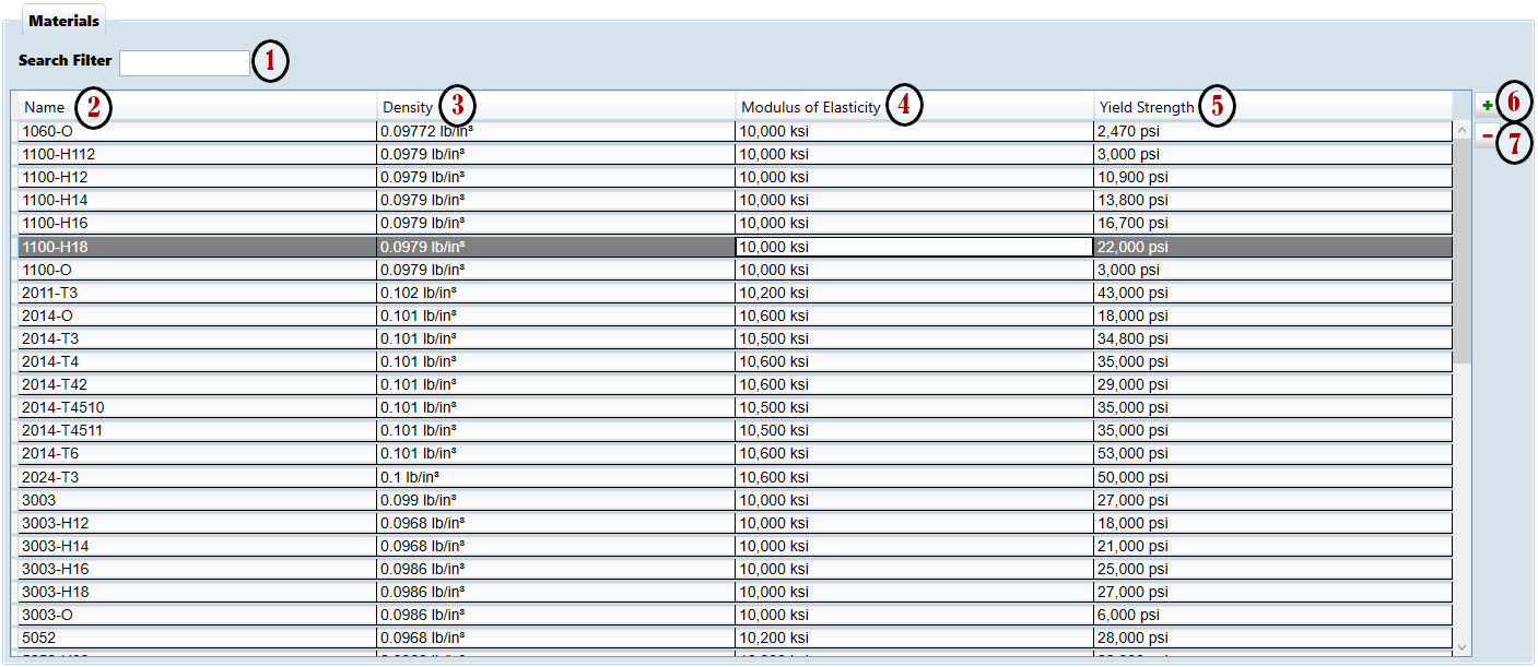 All of the calculations done by Yagi Mechanical® are based on specifications here in the Materials Tab. There are many built-in types of material included for commonly available tubing but if you need to add or change anything, below is a listing of the available options.